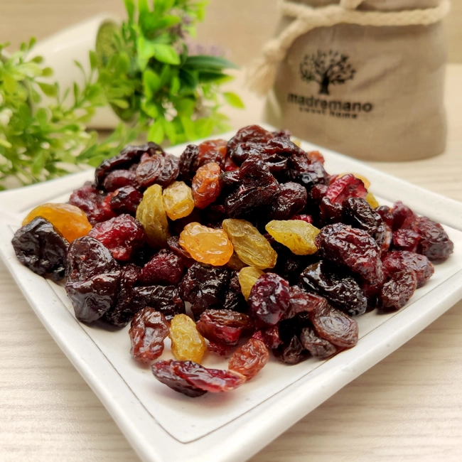 成分:蔓越莓、葡萄乾、青提子、蔓越莓片、櫻桃乾、黃金葡萄乾、藍莓乾、糖、葵花油、二氧化硫